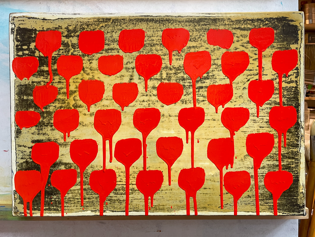 This painting was rediscovered while cleaning out my studio recently. It dates back to the 1990s, when I was experimenting with photo emulsions, resins, and wax. Encountering it again after decades in storage, I was unsure how to read it. I left it leaning against the wall while working on a new series concerned with gesture, marking, and expression as image. Around that time, I reread Oscar Wilde’s poem The Artist (1894), in which a sculptor melts down his own monument to sorrow in order to produce a fleeting image of pleasure. That act of destruction and transformation resonates here. The painting is both recovered and altered, negotiating between what persists and what exists only momentarily.